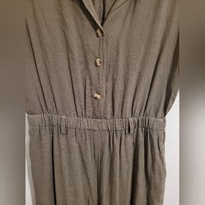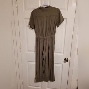 Super nice jumpsuit. Excellent condition. No belt but has belt loops. Made with Linen and rayon materials. Short rolled sleeves. Button up front. Has pockets. Feels soft. Tag says size small.