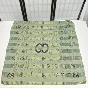 Vintage Large Shimmery Striped Gucci Logo Square Shape Headscarf. Lovingly worn, not torn or stained – looks in excellent condition. Very soft and drapey. Alternating shiny opaque and sheer stripes in olive green. Repeating black “GUCCI” text and interlocking G logo all over design. Center has large interlocking G design. No tags present. Style as a headscarf, neck wrap, belt, or chic accessory for handbags.
