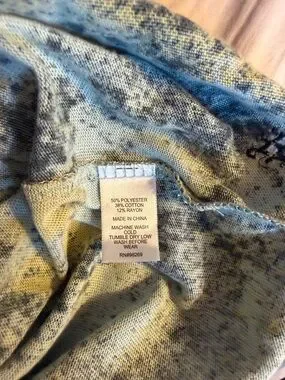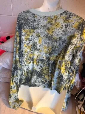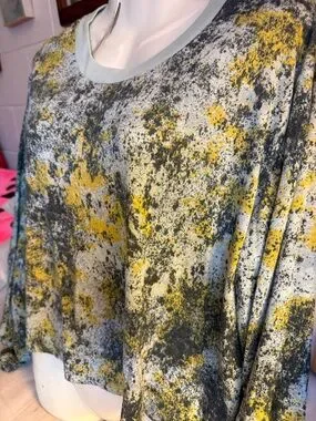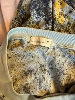 Alternative Women's Printed Ideal T-Shirt. It features a distinctive abstract watercolor or "splatter" print in shades of blue, yellow, and black on a light background, with a contrasting light blue ribbed crew neckline.