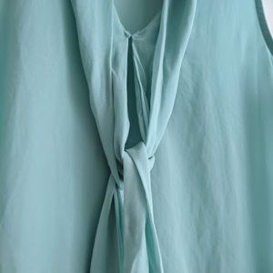 Alternative Apparel mint green sleeveless blouse. The shirt has a built in bow on the front you can tie or leave loose. The shirt also has a ruffled peplum. The fabric is on the sheer side, as I tried to show in the pictures. Size small