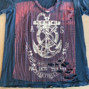 Selling this Alternative (brand) blue, pink and White (intentionally) distressed V Neck T shirt with pocket. I bought it at an upscale boutique in town. It's a size medium but fits like a large. Measurements below.