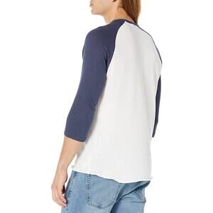 white and navy blue baseball tee.