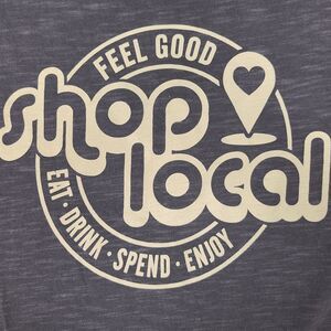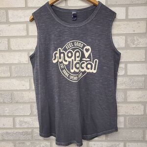 Size large heathered gray tank top. On the front it says "Feel Good Shop Local Eat Drink Spend Enjoy"