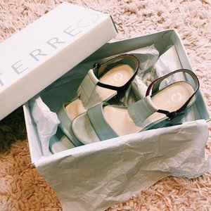 Alterre interchangeable shoes. Alterre Mist Grey Sandal. Size 6. Available for $190 on the brand's website. Interchangeable strap. Mulberry strap with grey tassel.