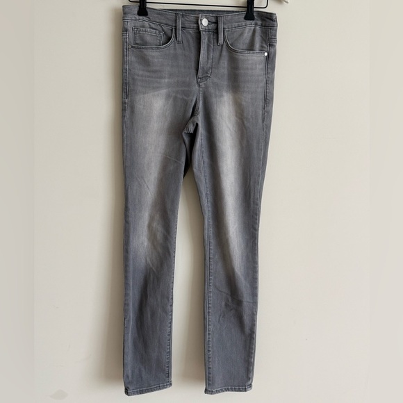 Soft gray denim jeans from Athleta with a comfortable bit of stretch. Classic five-pocket style with a zip and button closure. These have a 9” rise and a 28.5” inseam.
