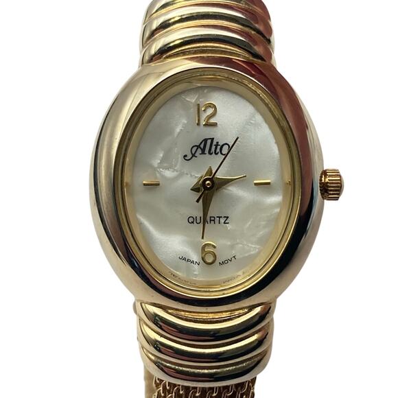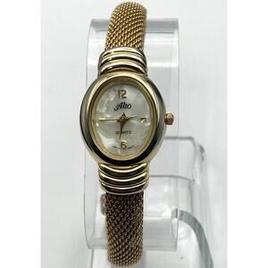 This is an Alto Quartz Cuff Bracelet Women's Watch. The watch is in very good pre-owned working condition. Please see all photos for details. The cuff band shows signs of use and wear.
