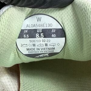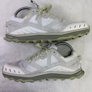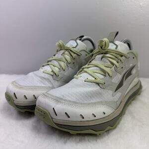 Altra Lone Peak 6 women’s trail running / hiking shoes in White and Green, size US 8.5. Trail‑ready shoes with roomy FootShape toe box, zero‑drop natural foot positioning, Altra EGO midsole cushioning, and durable MaxTrac + TrailClaw outsole for great traction on uneven terrain.