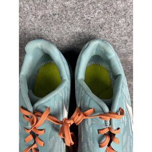 Color: Teal/seafoam upper with orange laces; white midsole; black/orange outsole