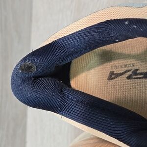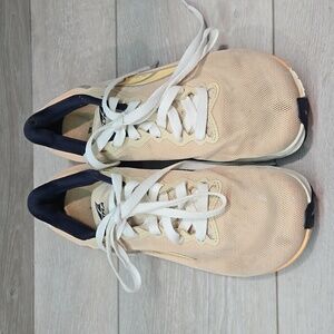 Stylish Reebok running shoes in beige with navy accents. Perfect for athletic activities.