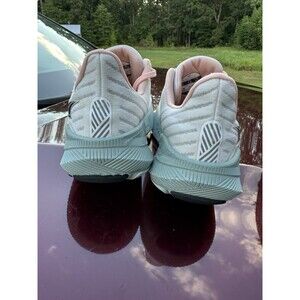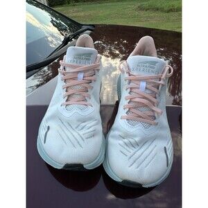Stylish Altra athletic shoes. White upper with light blue sole. Pink laces add a soft touch. Perfect for running and workouts.