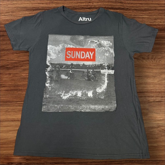 Keywords: Altru, graphic tee, t-shirt, men's, short sleeve, crew neck, casual, vintage, photo print, Sunday, motorcycle, large, cotton tee, gray t-shirt