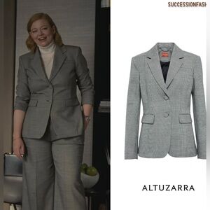 Altuzarra "Fenice" blazer in glen plaid. Notched lapel; two button front. Long sleeves. Flap pocket detail. Slim fit. Double back vent. Virgin wool/spandex/nylon. Lining, viscose/polyester. Made in Italy.