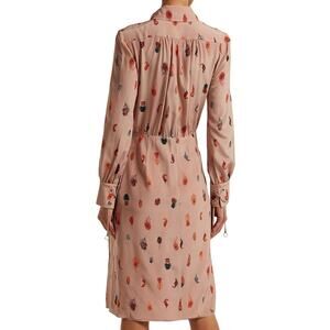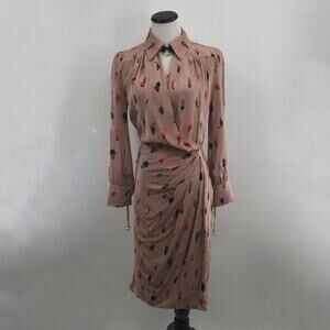 This collection reflects an autumnal color palette and coordinating motifs, including the orange, brown and black feathers printed on this salmon pink silk Kat dress. It’s made in Italy with a draped bodice and coordinating skirt that is shaped with gathers and folds, and is finished with leather and silver-tone rings and dangling straps as fastenings on the collar and cuffs. Tease out the label’s signature edge by styling it with leather accessories. Does not come with waist belt. Point collar. Black leather loop and press stud fastening. Long sleeves, loop trimmed cuff ties. Yoke line gathers. Side concealed zipper. Lightweight, fabric. Lined. Silk. Dry clean only. In excellent preowned condition.