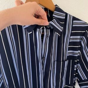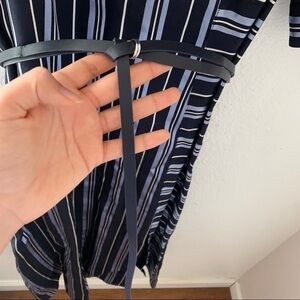 A polished runway piece with timeless appeal, this A-line shirt dress features crisp vertical stripes, a point collar, short sleeves, and a button front. Finished with a slim leather waist belt for a flattering shape. Made in Romania from a luxe lyocell-viscose blend.