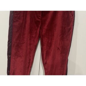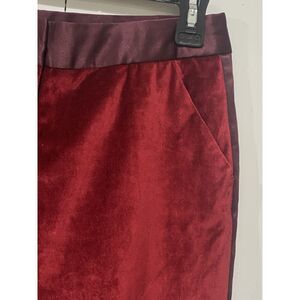Preowned without holes or stains Altuzarra for Target Women's Red Velvet Straight Leg Ankle Pants in size 2. The burgundy satin side stripes and waist band add a touch of sophistication. Body is 65% cotton and 25% rayon. Contrast stripe is 55% cotton and 45% polyester. with a 9-inch rise, 26-inch inseam, 28 inches waist and waist to hem length of 35 inches. Two side slip pockets with zip fly and hook closure.