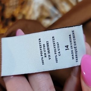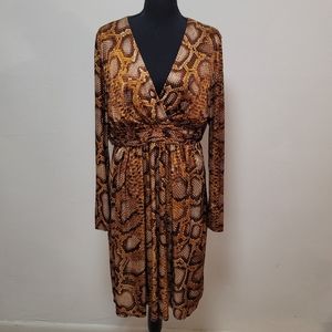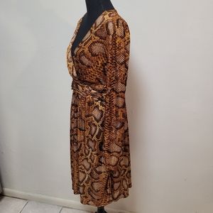 Size 14, EUC with no flaws, smoke-free home. Brown snakeprint knee-length dress with v-neckline and back zipper. Fully lined. Approximately 36" long, 18" pit to pit, 16" across waist. 100% polyester.