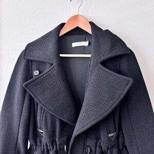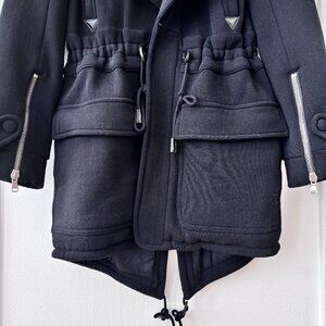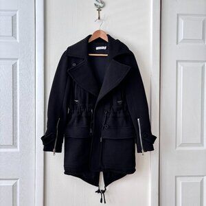 Black wool coat by Altuzarra featuring a wide notched collar, twin waist flap patch pockets and a cased drawstring waist. Crafted of black bonded wool-blend plain-weave, Altuzarra's Anderson parka is styled with a removable shearling collar trim (NOT INCLUDED) and a notched drawstring hem at back. Two-way zip fastening, concealed snap placket and zip cuffs with extended button tabs.