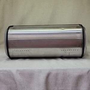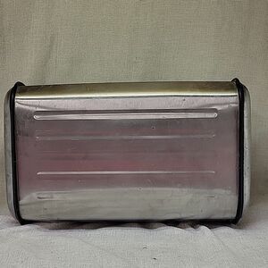 This vintage bread box is a perfect addition to any retro kitchen. The aluminum construction and silver color are both stylish and sturdy. The domed shape of the roll top lid adds a unique touch to this bread box. It measures 7.5 inches in height and 17 inches in length and 9 " depth, making it the perfect size for storing your favorite breads. The vintage style of this bread box will transport you back to the 1950s, and the quality construction ensures that it will last for years to come. Needs polished and shined but in good condition,