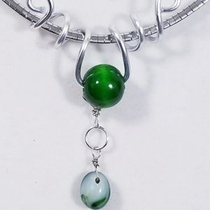 Aluminum Silver Spiral Pendant Worn on Any Necklace Green Wooden Bead Glass Drop