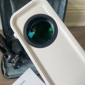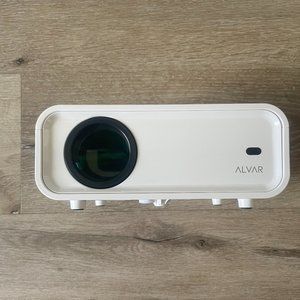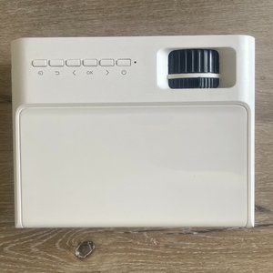 Comes with user manuals, cleaning tools, HDMI cord, connecting cord, and tripod. All items are in excellent, like-new condition. The projector is easy to connect to devices (laptop, phone, tablet, etc.) and speakers are great quality.
