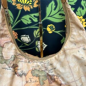 Travel in style with this vintage-inspired hobo bag from Alviero Martini. Featuring the brand’s signature world map print on coated canvas with soft tan leather trim, this Italian-made bag adds instant wanderlust to your wardrobe.