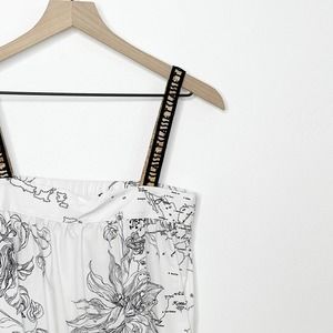 Alviero Martini 1Classe New White Dress. Drop waist tiered midi tea length style dress. Sleeveless, graphic lettering on straps. NWT, new with tags. never worn, Floral patterned throughout.
