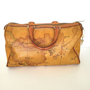 Alviero Martini Vintage Duffle Boston Bag Purse Map Pattern Leather Brown Large
