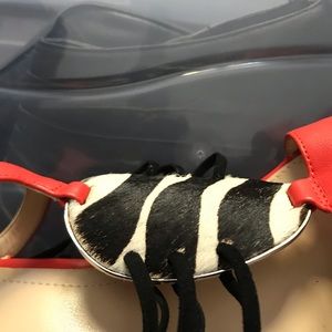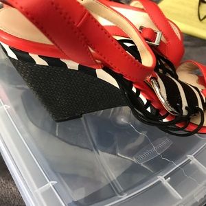 Calvin Klein leather strappy wedge sandal. Orange, black and black & white accent. 4” wedge, ankle strap.