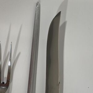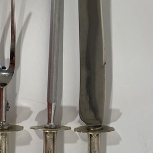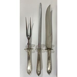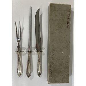 This is a vintage Alvin carving set from the 1920s. The set includes three pieces, each with a stainless steel blade and a sterling silver handle featuring the Della Robbia pattern. The set is perfect for carving meats and poultry and would make a great addition to any antique or silver collection.