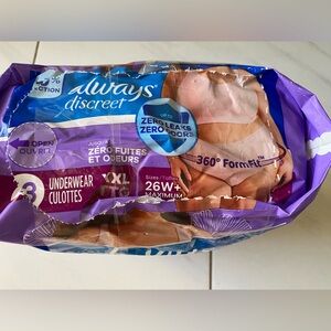 Always Discreet underwear in XXL size. Features a purple and blue design. It is brand new but one of the bags top got open - nothing missing I taped it up - total 26 count no tags