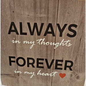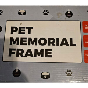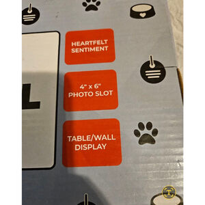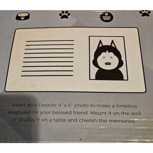 New in open box, this pet memorial frame is made of wood composite material. It features a 4"x6" photo slot, a built-in stand for tabletop display, and can also be mounted on a wall. The front displays the sentiment "Always in my thoughts, Forever in my heart." The packaging indicates it's a Heartfelt Sentiment Pet Memorial Frame. No visible imperfections are present.