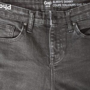 Skinny, stretch, comfy, black denim, ripped design on both knees. This is cute to pair with simple white top with blazer and heels for party or simply wear with flats or sneakers for everyday or casual look. Used once only, it is very clean and perfect condition (i gained weight due to my injury and my clothes no longer fit), thank you so much for your support=)