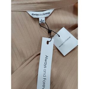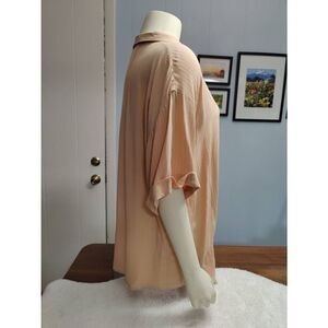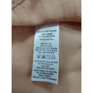 Beautiful peachy pink Always and Forever button down blouse with tie at waistline, NWT. This blouse has short sleeves with cuffs and fabric covered buttons. Pit to pit 22" and length from shoulder to hem 25". Measurements are approximate. Bundle and save!