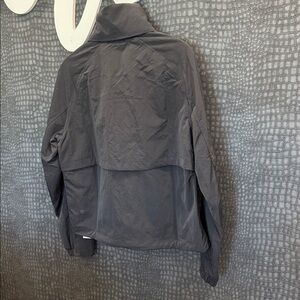 Stylish dark gray jacket featuring a high collar and front pockets. Perfect for a sleek, modern look.