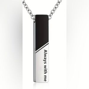 Always with me cube urn necklace this necklace is new in package and comes with a black metal gift box. The necklace is new from a smoke free and pet free home, does have plastic on necklace to prevent scratches before using.