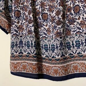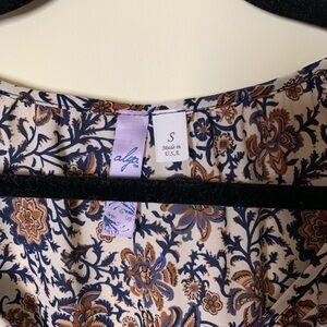 Alya cream blouse with tan and navy floral pattern scoop neck with key hole detail. Three quart length sleeves size small