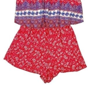 Alya Francesca's Romper Womens Size XS Red Blue Bohemian Print Lace Detail