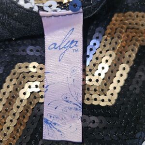 Description: Alya sequin halter dress, junior women’s M, black/gold/white with heavy sparkle—perfect for party looks.