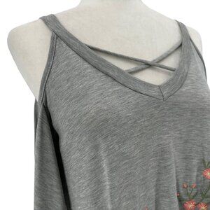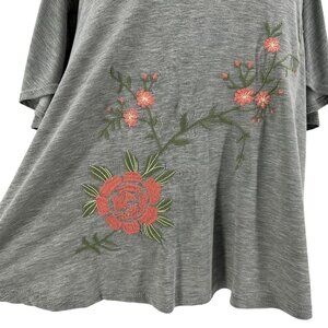 Short sleeve cut out pullover V-neck heather gray blouse tank top. Lightweight. Embroidered floral multicolor stitching on front. Material has a stretch. Modal blend. Made in USA.