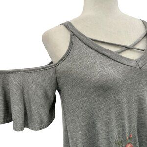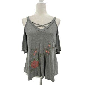 Alya Womens Small Top Embroidered Floral Cut Out Sleeve Gray V-neck.