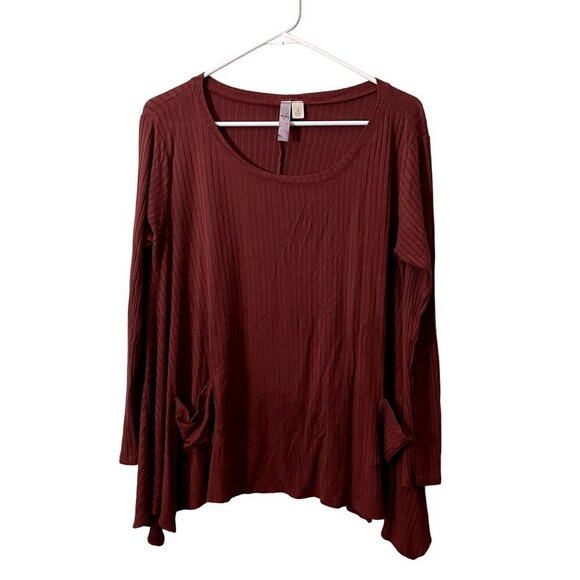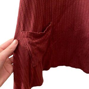 A deep coral knit ribbed long sleeved sweater with pockets. Made of 95% rayon and 5% spandex.