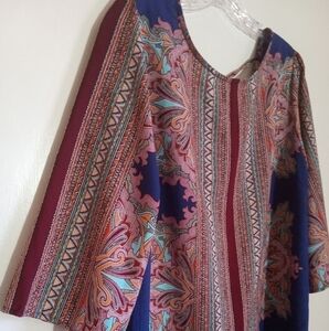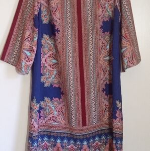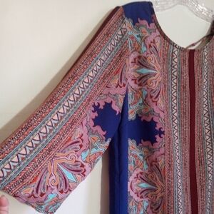 Alya ethnic style 3/4 kimono sleeve longline tunic or midi dress with open vneck back with ties. Women's size large. Polyester fabric. No flaws noted.