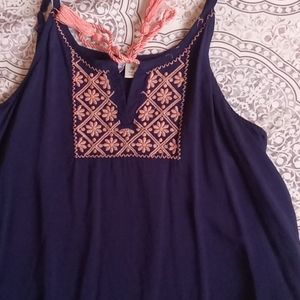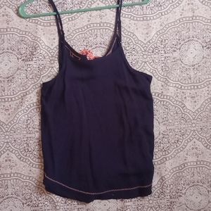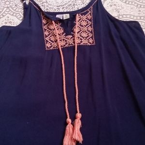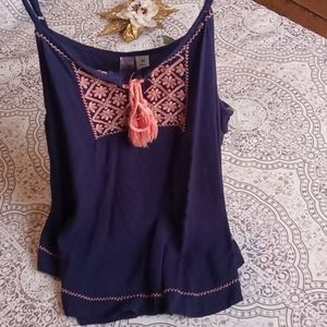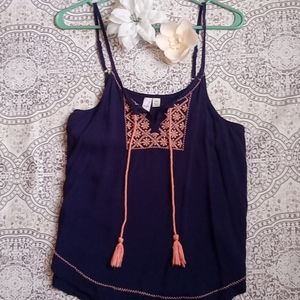 super cute dark blue spaghetti strap tank with really pretty floral design around the neckline with a slit in the chest with two strings hanging down that can be tight or not the tank is dark blue but the color detail and design is a coral color he's a super beautiful tank top that can be for any occasion you can dress it up or down it is so pretty that it will look good either way it will make an outfit if you dressed it up and it will be that little something extra to go with your casual look that makes your casual just that much more awesome than the usual casual look it is a size medium and I'd say it's true to size it was never worn I tried it once to see the look of it and that's all it's been warm it is real saying lightweight material and the color combo is so cute it is a for sure must have because the many different styles and looks it can go with the fact that it's pretty enough to be dressed up but yet got that look where you can also work casual but it will make any outfit that much better size medium made by Alya