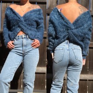 Such a warm and fuzzy stretchy sweater that is so cute. This could also fit a medium as well. Very soft and fuzzy knit like material So universal, I wore it a few different ways. Wear it with the twist in the front or the back. Material is nylon and acrylic Like new, haven’t been worn out Color is like a bluish teal. Taken in sunlight All measurements are in inches and laying flat Bust: 22, 28 stretched Waist: 18, 27 stretched Length: 24 front, 7 back (where the twist is) Sleeves: 20