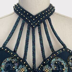 Alyce Designs Beaded Gown Long Teal Strappy Back Zip Closure Size 2 Side Slit
