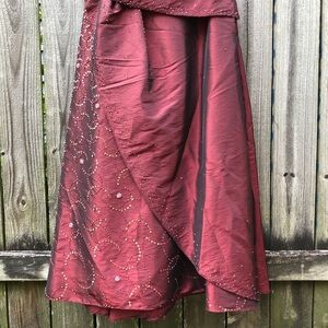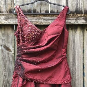 Alyce Designs formal maxi dress in a deep wine red. Lovely beading and sequins. Fully lined, with an extra layer of tulle at the skirt for volume. The fabric is gathered at the side waist, creating beautiful drape and movement. Side zip. Excellent condition, no flaws. No size tag, so the size has been estimated to be a size 12 based on measurements. Please double check to ensure a good fit.