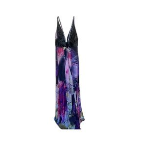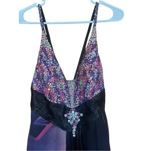 Stunning Alyce Designs gown, perfect for formal events or prom. This vibrant and elegant gown features a deep V-neck with intricate beading along the neckline and a unique abstract multicolor design that flows beautifully with movement. The back design has a glamorous low cut with beaded accents.