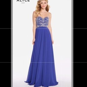This Alyce Paris 60045 A-line prom gown features an intricately beaded bodice over a flow chiffon skirt, crowned with a strapless sweetheart neckline. The semi-open back is offsetted with a full-length skirt and sweep train.