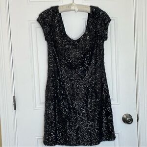 Stunning Black Sequin Cocktail Dress! You can't go wrong stepping out in this classic and timeless style. With a scoop front neckline and low back, this dress has the perfect backdrop to showcase your funky style with any accessories! Short cap sleeves give you the comfort of dancing all night long!