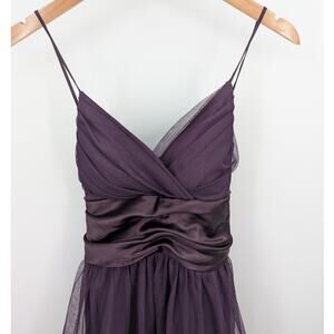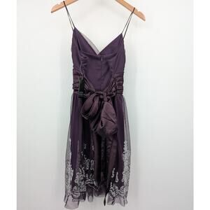 This beautiful Alyn Paige New York cocktail dress (size 13/14, see measurements below) features a deep plum satin and tulle overlay adorned with intricate silver embroidery. The dress has a flattering V-neckline with delicate spaghetti straps, a ruched satin waist that ties into a dramatic back bow, and a flowy A-line skirt with embroidered hem detail for a romantic, elegant finish. Fully lined with back zipper closure. Perfect for homecoming, prom, weddings, or evening events.